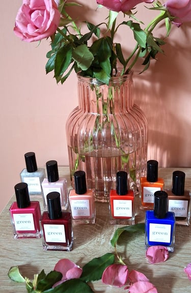 Nous travaillons avec les vernis de la marque "Manucurist" (Green™) composés d'une formule unique, ultra-pigmentée, vegan, biosourcée jusqu'à 84%, excluant toute molécule controversée issue de la pétrochimie.